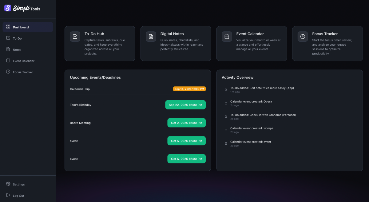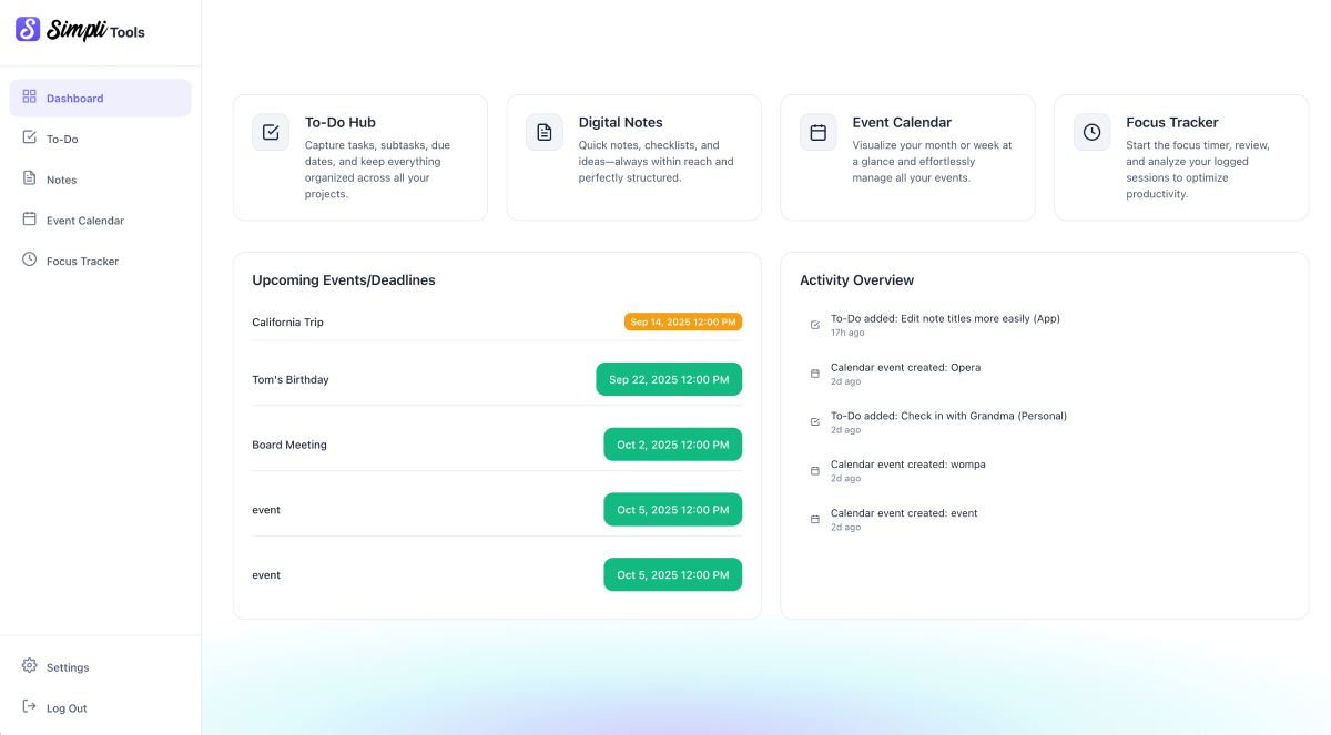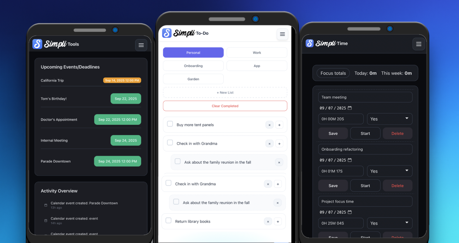 SimpliTools brings your To-Do, Notes, Calendar, and Time Tracking into a single, clean interface with real-time sync and smart summary notifications.